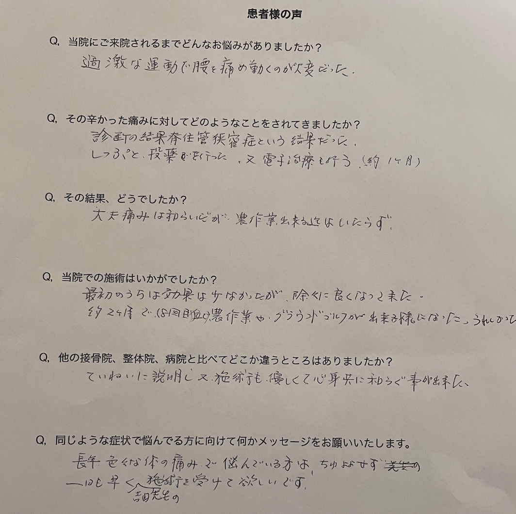 私の人生の4分の3は腰痛と共にあったので、半ばこの痛みとは一生付き合っていくのだと諦めていた時に先生の治療を受けて、30年ぶりぐらいに痛みのない生活が送れているので、皆さんも諦める前にぜひ先生の治療を受けていただけたらと思います。