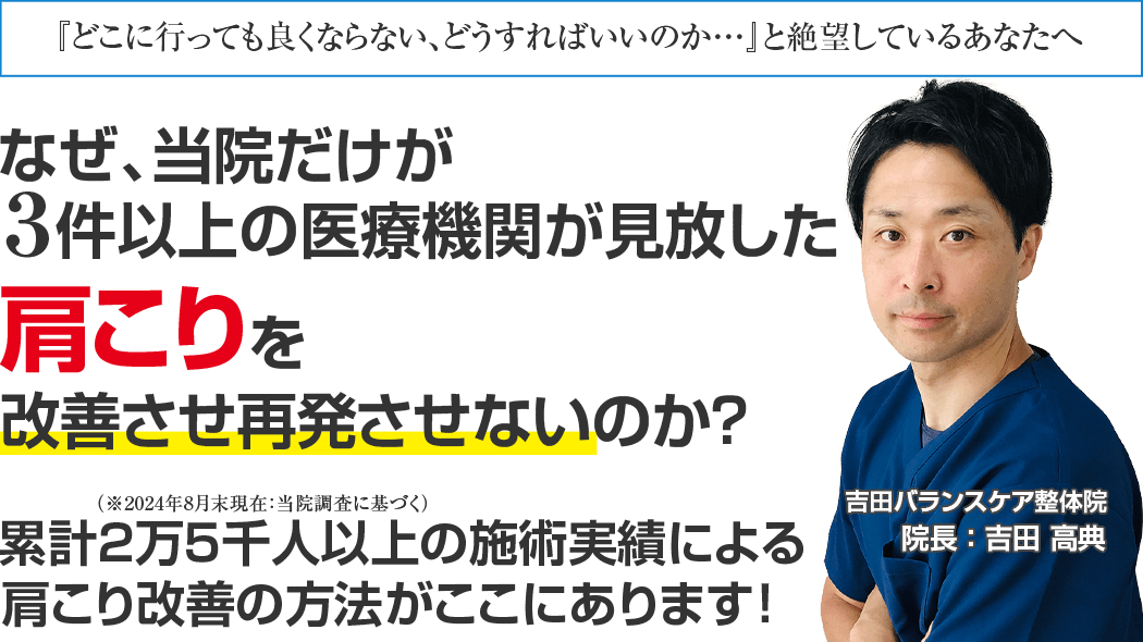 吉田先生ならあなたの悩みを解決してくださいます。根本的に肩こりを改善されたい方は是非、頼ってみてください。