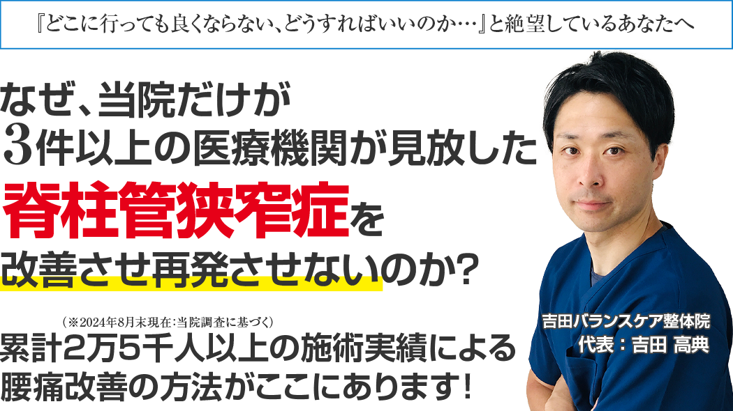 吉田先生ならあなたの悩みを解決してくださいます。根本的に脊柱管狭窄症を改善されたい方は是非、頼ってみてください。