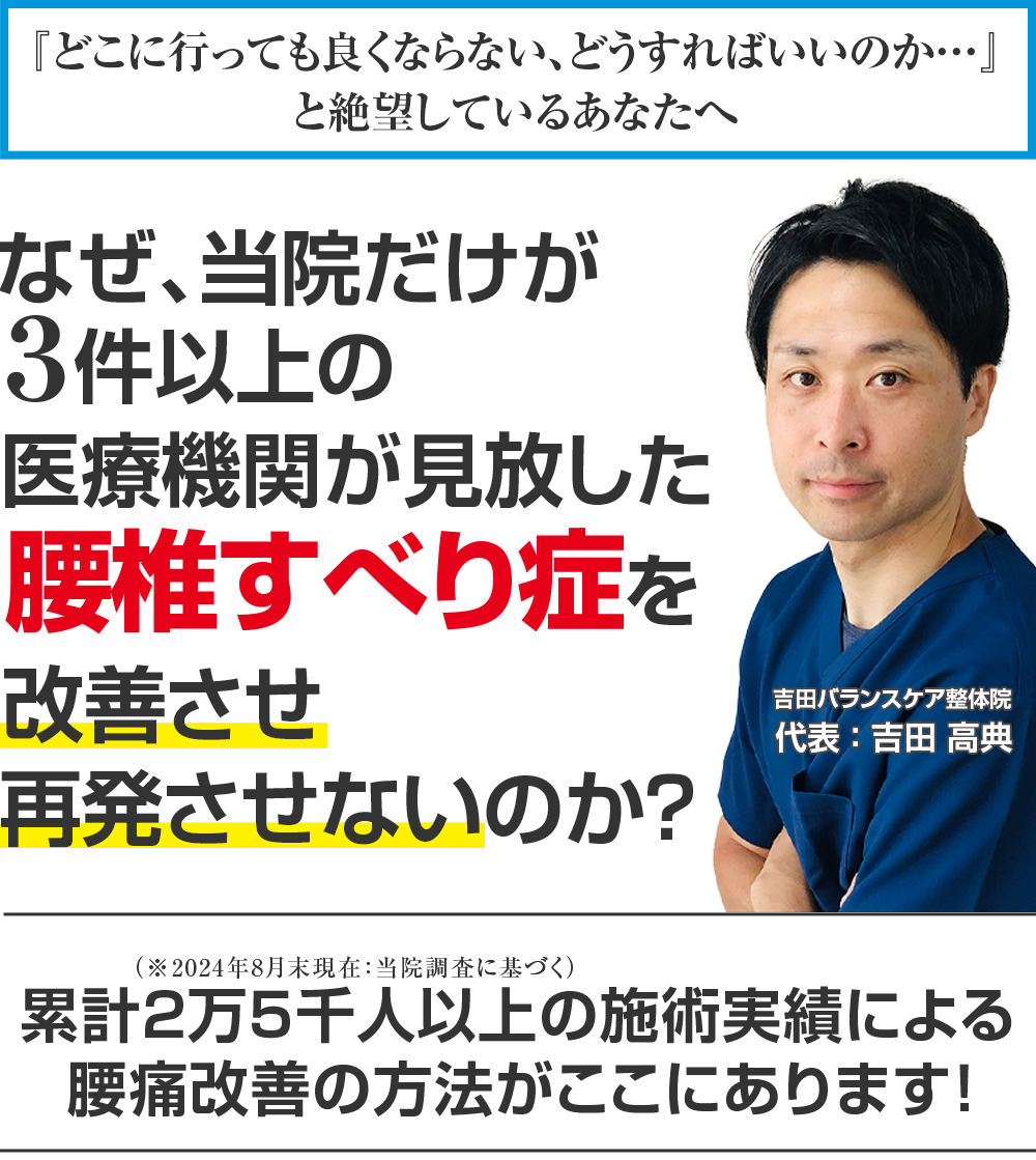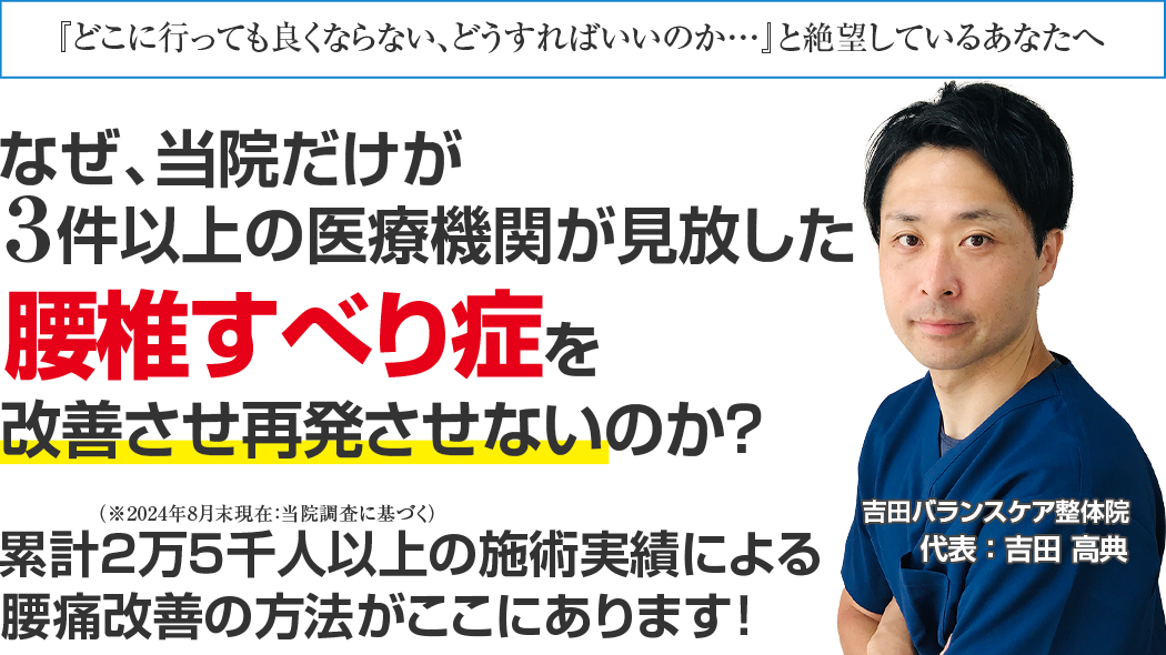 吉田先生ならあなたの悩みを解決してくださいます。根本的に腰椎すべり症を改善されたい方は是非、頼ってみてください。