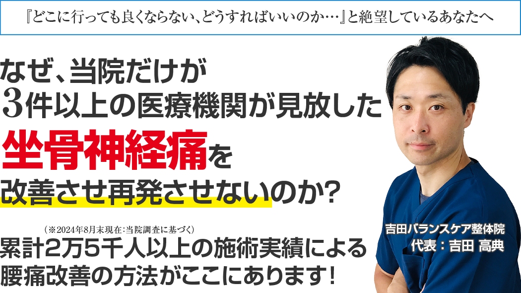 吉田先生ならあなたの悩みを解決してくださいます。根本的に坐骨神経痛を改善されたい方は是非、頼ってみてください。