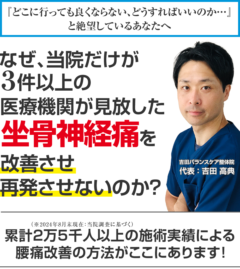 もしあなたが上記のようにお悩みであれば、一度吉田バランスケア整体院 上尾院に来て、「痛みの根本」から坐骨神経痛を改善していきませんか?ということです。